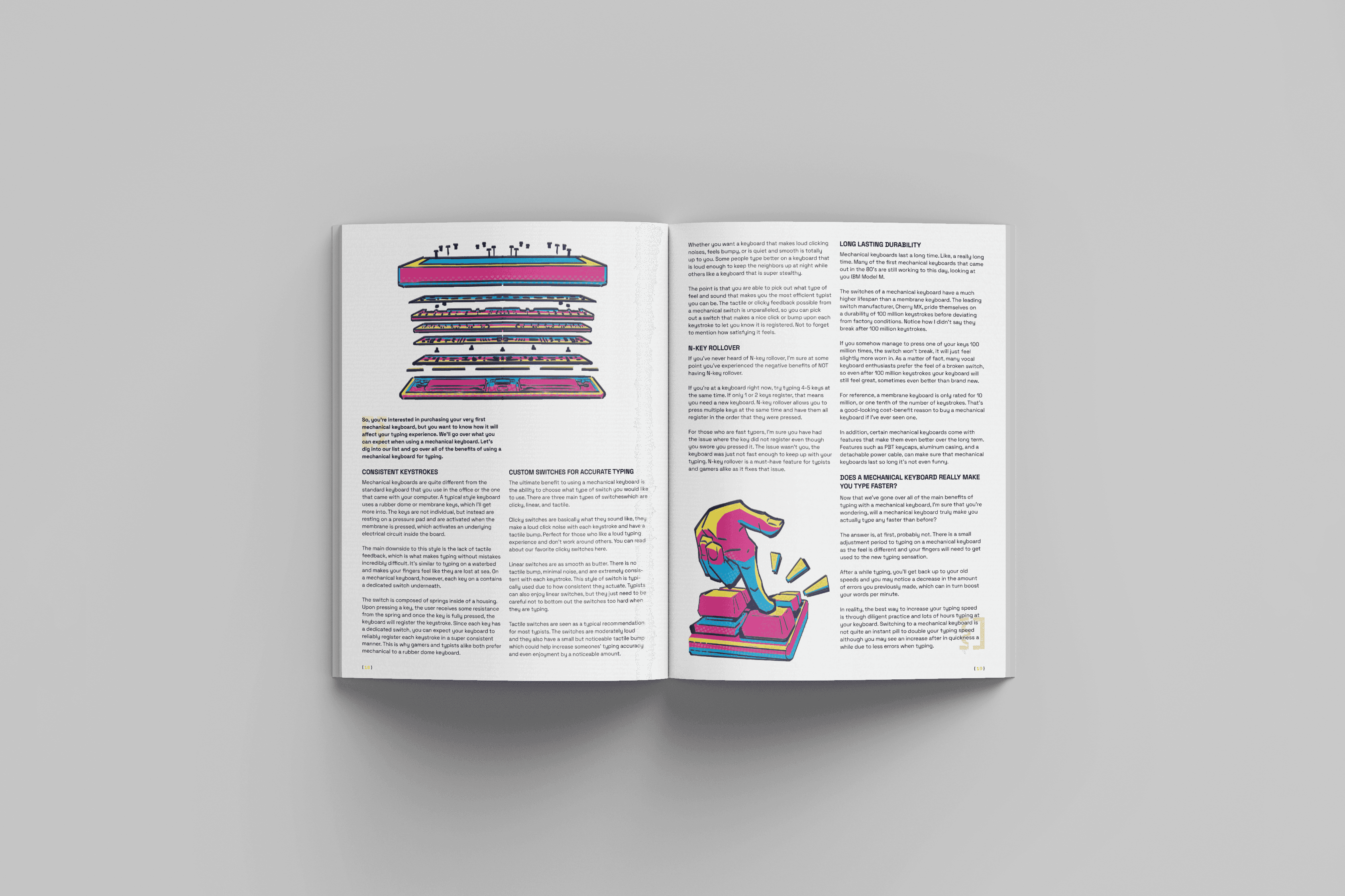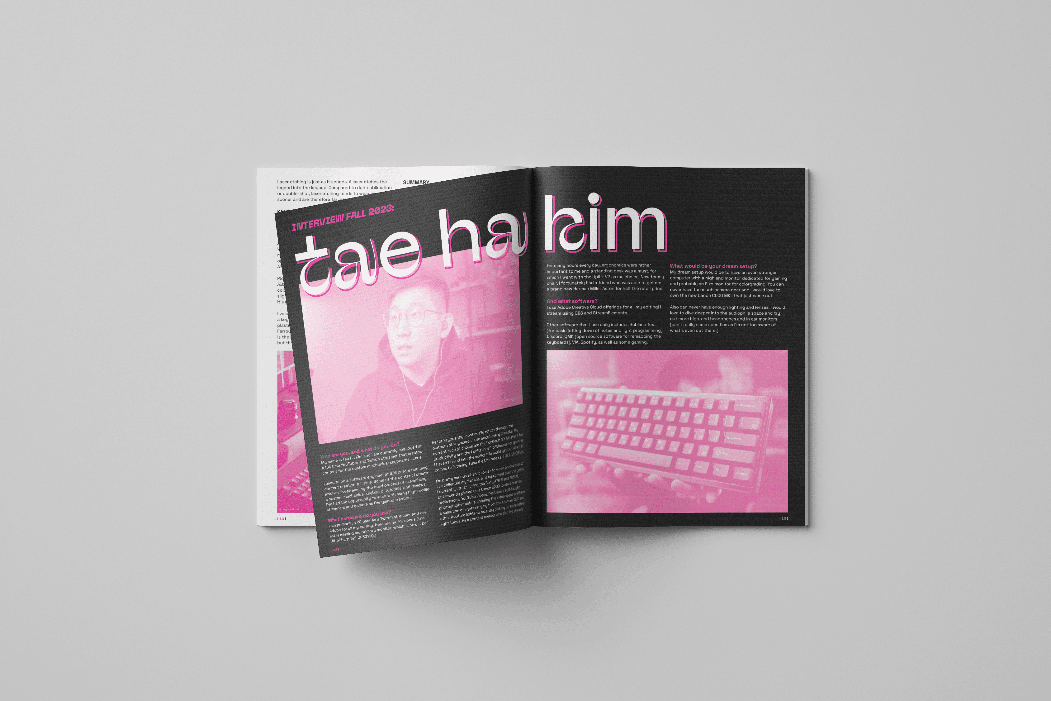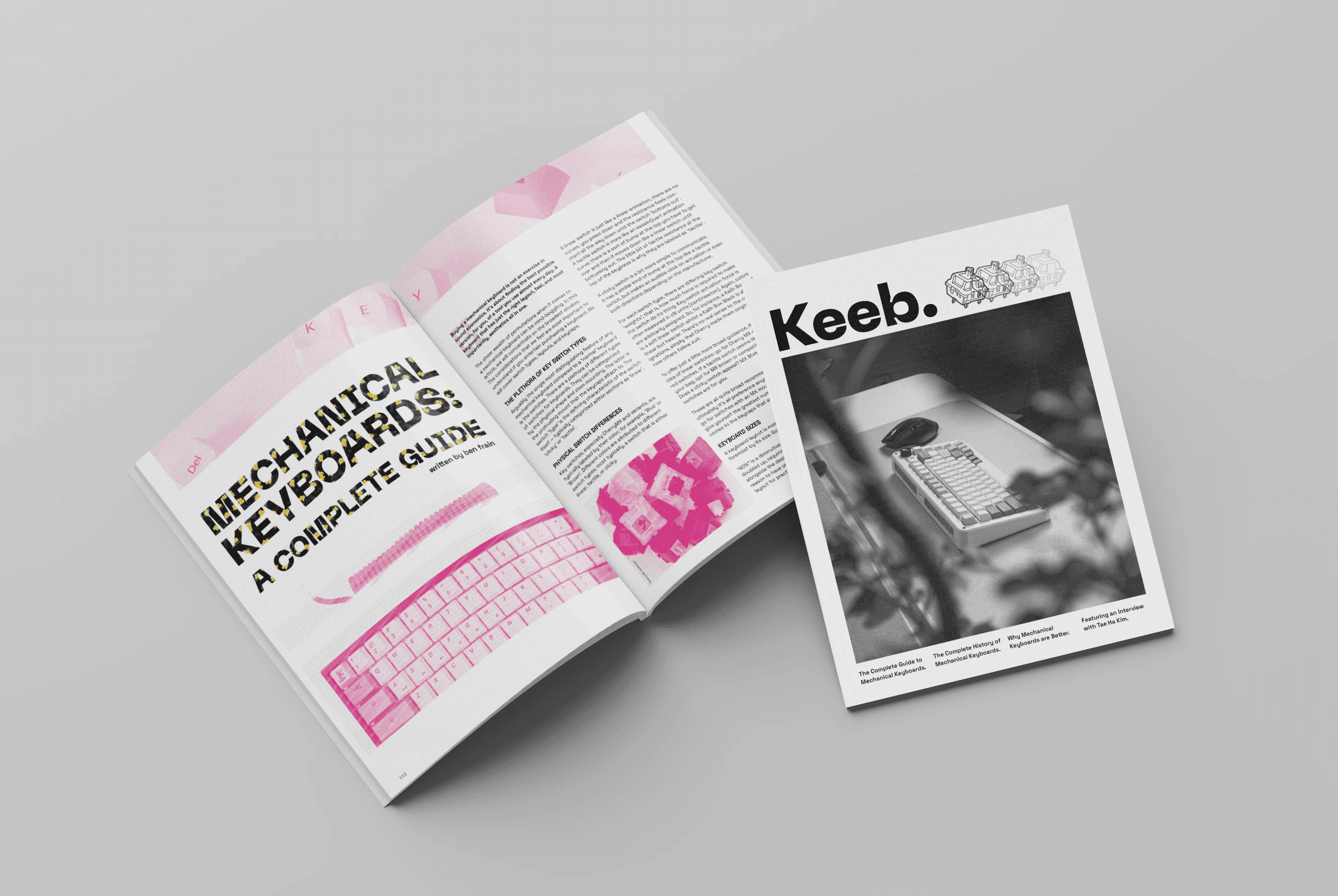 The main objective with Keeb. was to create a publication focused on educating those who are new to the Mechanical Keyboard space. It allows people to enter a complex hobby without the intimidation that is typically associated with such a large amount of information. I also wanted to begin building a larger brand identity around Keeb. so that I could create later issues when I find the time, thus leading to the creation of the "K." identity mark and use of stickerbombing.